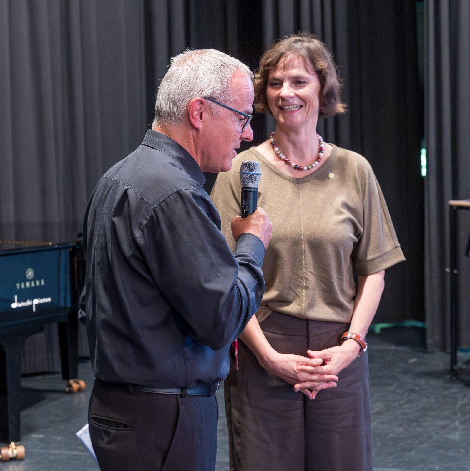 Christian Maeder, Präsident Thurgauer Kantonalmusikverband. Gespräch mit unserem Präsidenten an einer Rangverkündigung am OSEW 2025.